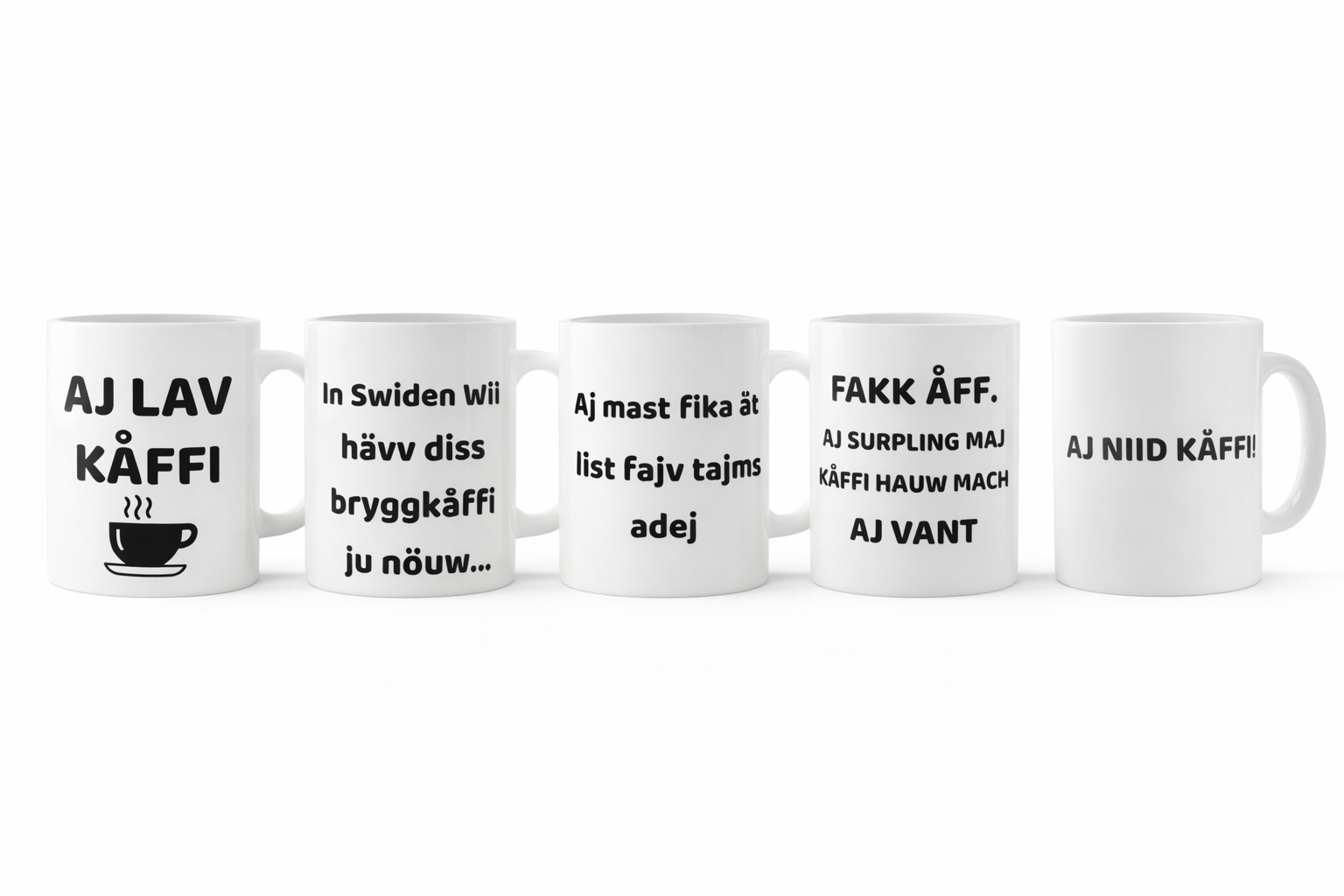 Varje mugg i kollektionen har ett färdigt tryck med roliga, torra och träffsäkra svengelska uttryck som passar lika bra hemma vid köksbordet som på jobbet. Det är muggar som får kollegor att le, familjen att skaka på huvudet och dig själv att känna dig märkligt förstådd.