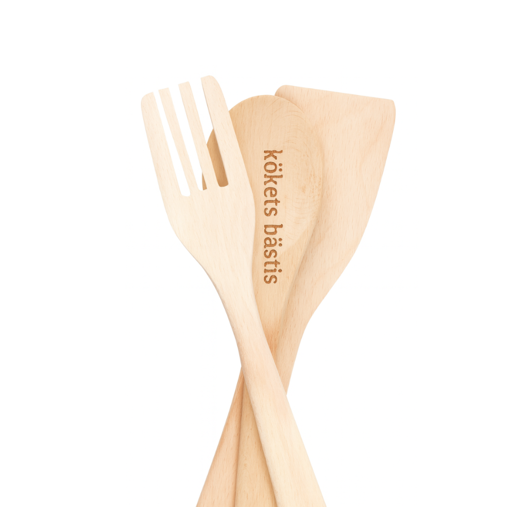 Det här praktiska kökssetet i FSC®-märkt bokträ innehåller tre oumbärliga redskap för hemmakocken: en stekspade, en träslev och en trägaffel. Alla delar är tillverkade i naturligt trä som är både slitstarkt och skonsamt mot kastruller, stekpannor och bakplåtar – även de med känsliga non-stickbeläggningar. Med sin avskalade design och lena träyta ger redskapen en rustik känsla och ett harmoniskt uttryck i köket. Ett stilrent set som passar lika bra till matlagning som till servering.