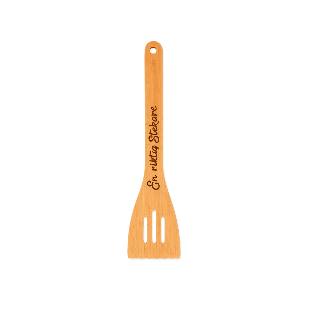 Med sin enkla och naturliga form är denna träspatel både funktionell och vacker. Men det är först när du adderar en personlig gravyr som den förvandlas till något riktigt meningsfullt. Ett namn, en hälsning eller ett internt skämt – plötsligt är det inte bara ett verktyg i köket, utan ett minne som används dagligen. Den är stadig, stilren och passar perfekt för såväl vardagsmat som söndagsstekar.
