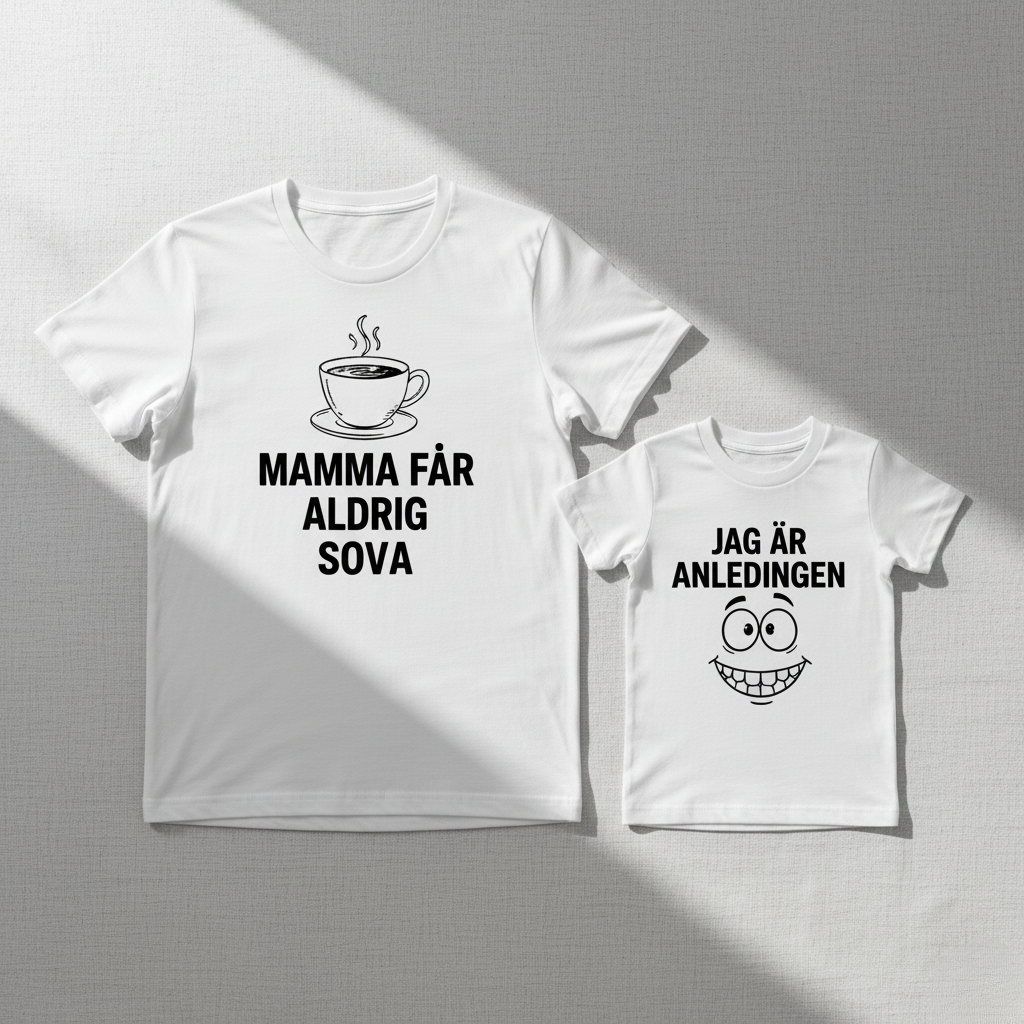 På mammas tröja står det rakt upp och ner: Mamma får aldrig sova – med en kaffekopp som säger allt. På barnets tröja kommer den perfekta fortsättningen: Jag är anledningen. Inte elakt. Bara ärligt. Och lite för träffsäkert för att inte bli kul.