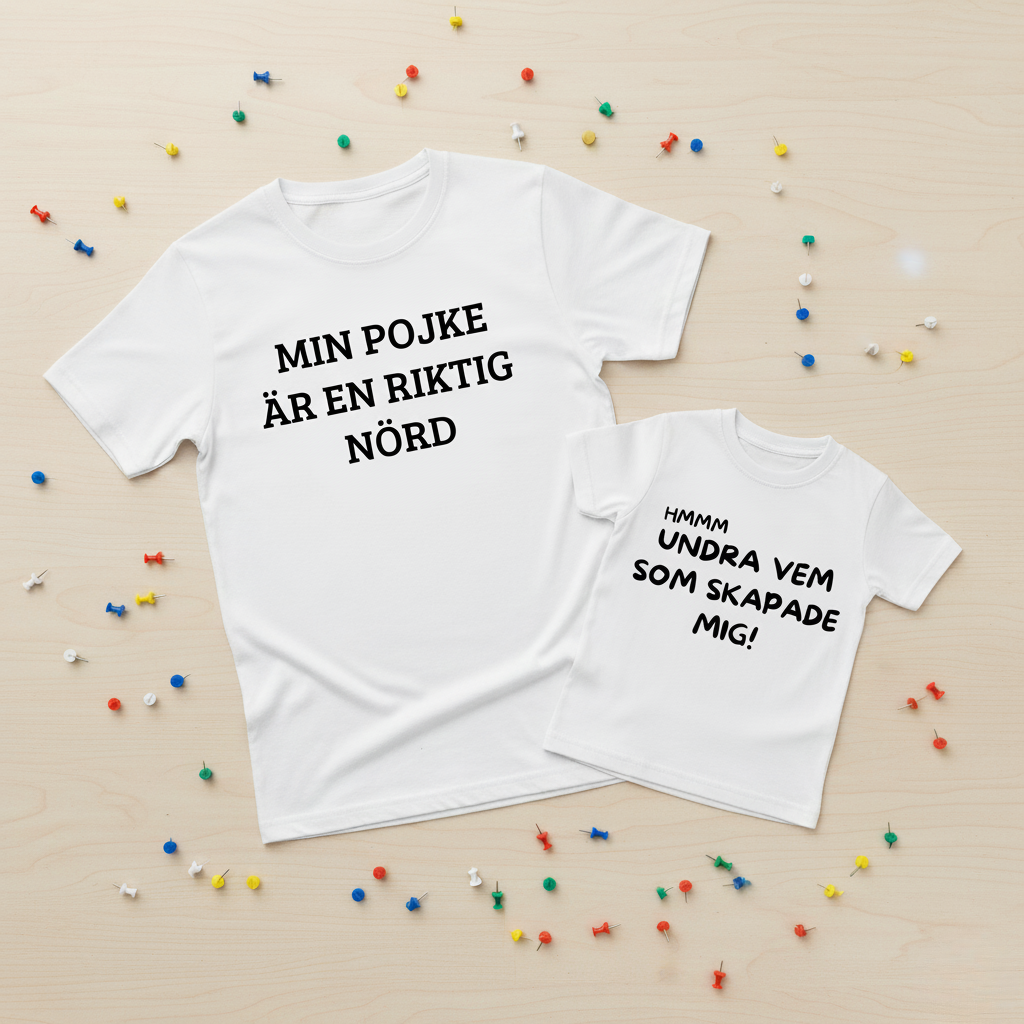 Mini-Match® för er som gillar att driva lite med varandra – på det där varma sättet som bara funkar mellan förälder och barn. Den vuxnes tröja säger det rakt ut: “Min pojke är en riktig nörd”. Och den lilla svarar med ett självklart, kaxigt konstaterande: “Hmmm… undra vem som skapade mig!”