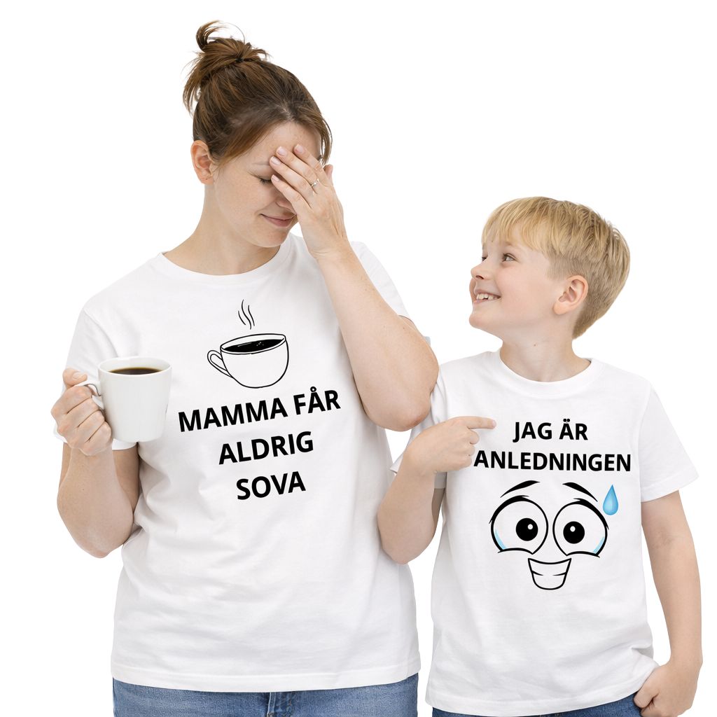 På mammas tröja står det rakt upp och ner: Mamma får aldrig sova – med en kaffekopp som säger allt. På barnets tröja kommer den perfekta fortsättningen: Jag är anledningen. Inte elakt. Bara ärligt. Och lite för träffsäkert för att inte bli kul.